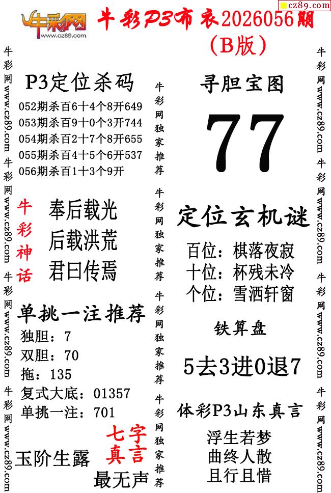 牛彩P3布衣26年056期AB版图谜(精华版)-「3d试机号」今天_金码查询-福彩3d试机号近10期